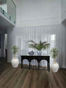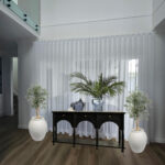 Finally, lush greenery and fresh floral arrangements throughout the home bring vibrancy and life to the traditional neutral palette, creating a space that feels as refreshing as it is inviting.