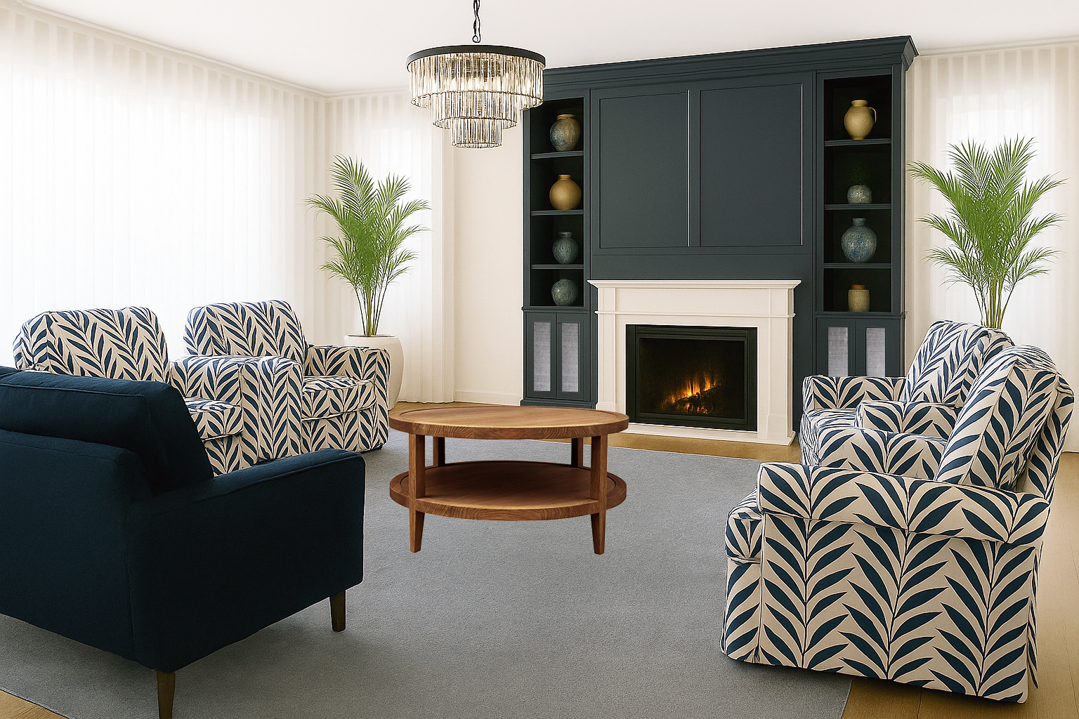 The key to this style is creating a relaxed, inviting atmosphere. Picture oversized sofas with slipcovers, adorned with bold striped and floral cushions in ticking, chintz, or piping. Accentuate the space with wooden sideboards, rattan chairs, and layers of blue and white ceramics. A few well-placed tray tables and beautiful coffee table books add the perfect finishing touches